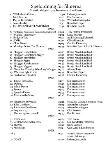 En dansfilmfestival för och i offentliga rum. Festivalen är konstnärsdriven och utgör ett forum och en arena för verksamma dansare, koreografer och filmare att möta ny publik och nya miljöer genom mediet dansfilm / koreografi för film / dance for screen / screendance. Festivalen visar ljudlösa videoverk utomhus av och med dansfilmskapare med koppling till Göteborg, Västra Götalandsregionen och Halland. Festivalens besöksadresser står längre ned på sidan. Program! 10-13/2 19.00-20.30 visas 21 ljudlösa verk av 17 konstnärer utomhus vid CHUCK&BRUNO i kategorierna GIF, 60s, 1-3 min och 3-7 min.  Det finns inget krav på att verken ska vara nyproducerade men de ska inte visats på festivalen tidigare. Information om verken här. Workshops 9+10/2 Under festivalen erbjuds workshops med Helena Jonsdottir (Island/Belgien) och Ingrid Nachstern(Irland) på Danscentrum Väst i samverkan med Konstnärsnämndens internationella program för dans Info: Workshop Danscentrum Branschdag 12/2 förlagd hos CHUCK&BRUNO med panelsamtal, forum och en curaterad del där internationella gäster finns på plats med visningar av deras prisbelönta dansfilmer. Exklusivt för festivalen är en urpremiär samt arkivfilmer, alla producerade i Göteborg. Representanter från Göteborg Stad Kultur; Dans och Film, finns närvarande. Program Det curaterade programmet visar åtta dansfilmer med ljud av: Helena Jonsdottir, Ingrid Nachstern, Liz Aggiss & Joe Murray, Douglas Rosenberg, Ami Skånberg Dahlstedt, Gun Lund & Lars Persson och Danceremainings. Visningen är inomhus hos CHUCK&BRUNO på Ringön 12.00-14.00 samt 16.00-18.00. Under kvällen på VEGA bryggeri kan tysta dansfilmer ses i deras restaurang. Där finns Dansfilmfestivalens öl på tapp! Festivalens t-shirts och stickers kommer från Made in Ringön vilka också medverkar till att festivalen kan genomföras. Dansfilmfestivalen genomförs med Utvecklingsstöd Göteborg Stad, Kulturrådet, i samverkan med Konstnärsnämndens internationella program för dans Konstnärsnämnden, Danscentrum Väst och GU-Centrum för kritiska kulturarvsstudier inom konceptet KOREOARTscape / Dansverk i nära samarbete med CHUCK & BRUNO och Made in Ringön mfl. Festivalen samverkar även med en rad lokala, regionala, nationella och internationella nätverk inom genren Dansfilm / Dance for screen / Screendance och Dansmuseet i Stockholm. I Tranemos och Ulricehamns Bibliotek visas det tysta dansfilmsprogrammet 10-13/2. Konstnärlig ledare Benedikte Esperi Projektledare & grafisk design Olivia Alf Kommunikatör & koordinator Cheyenne Esperi Följ festivalen på FB & Instagram Läs i Göteborg Direkt Adresser: CHUCK&BRUNO  Manufakturgatan 8/Järnmalmsgatan 6, Göteborg MADE IN RINGÖN Ringögatan 13, Göteborg VEGA bryggeriet, Manufakturgatan 2, Göteborg Danscentrum Väst Ärlegatan 3, Göteborg MÅL -Stärka fältet lokalt och regional i Göteborg, Västra götalandsregionen och Halland. -Visning och spridning av dansfilm i offentliga miljöer och andra rum. -Främja nätverkande och kunskap lokalt, regionalt, nationellt och internationellt inom genren. -Vara en mötesplats för fria utövare, institutioner, professionella, nybörjare och vardagligt nyfikna. -Vara årligt återkommande. -Danskonsten i fokus genom mediet ljudlös film/rörlig bild för allmänheten på offentliga platser. -Öka tillgänglighet och kulturellt kapital till staden. -Växa hållbart. Göteborg Stads formulering för beviljande av utvecklingsstöd 2021: ‘Dansfilmen har under senare år fått en allt starkare plats i det lokala kulturlivet och en sådan festival bedöms kunna stärka konstfältet än mer, samt befästa Göteborg som en av landets viktigaste platser för dansfilm. Ett stöd bedöms kunna bidra till såväl verksamhets- som branschutveckling, liksom på sikt till konstartsutveckling.’ För press / media kontakta dansfilmfestivalen(at)gmail.com Festivalen tar ej ansvar för eventuella brott mot upphovsrätten i inskickade bidrag.